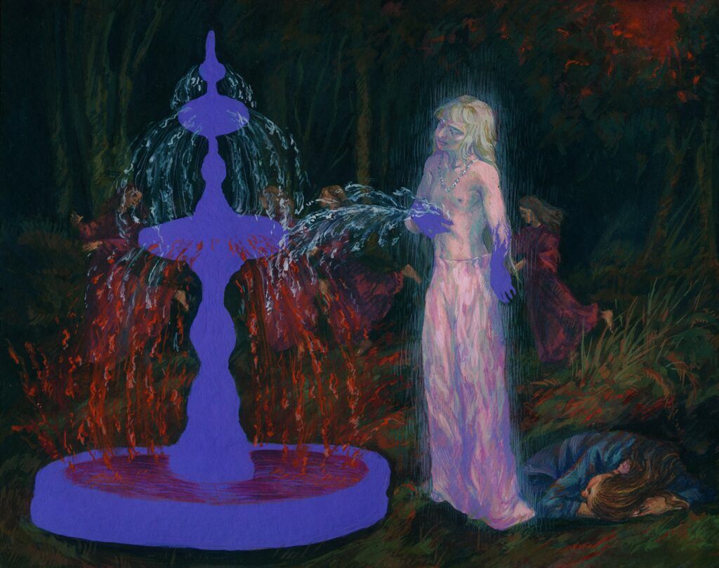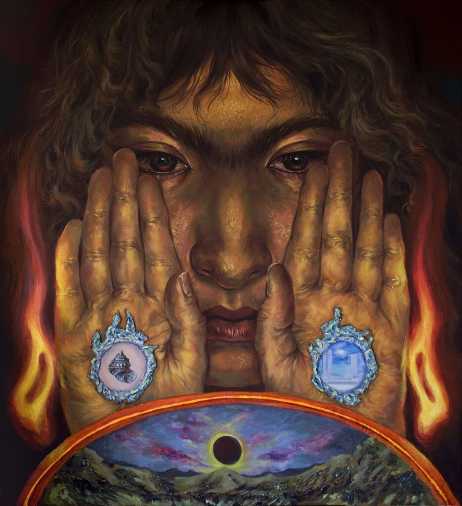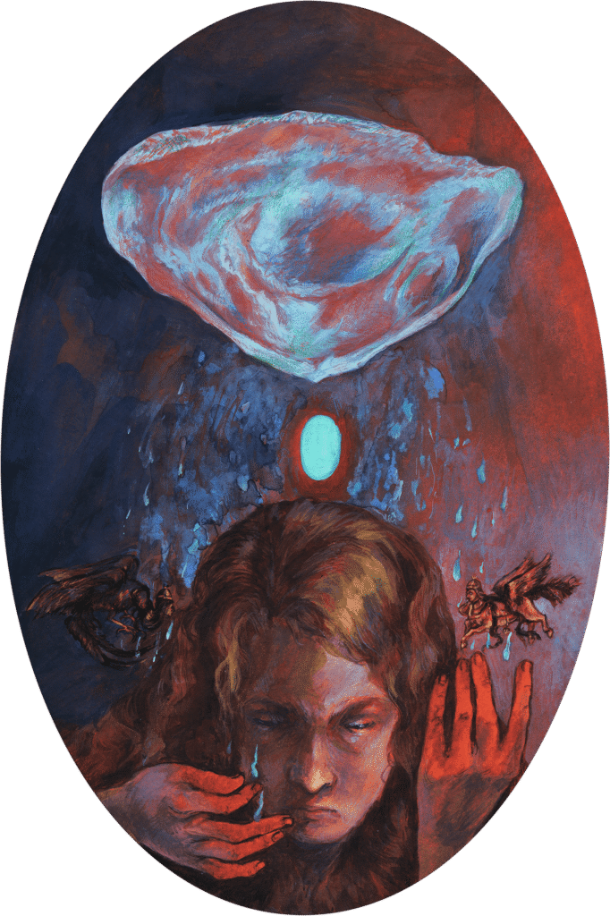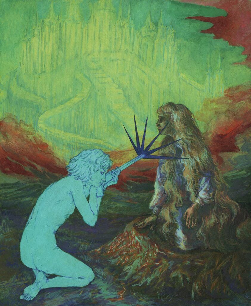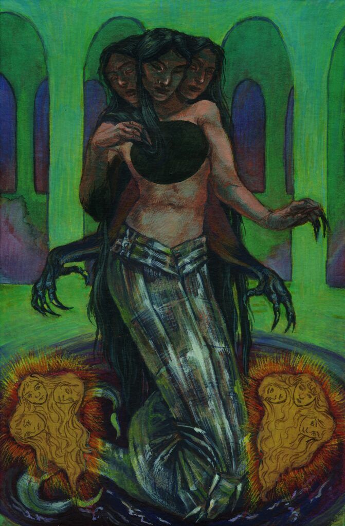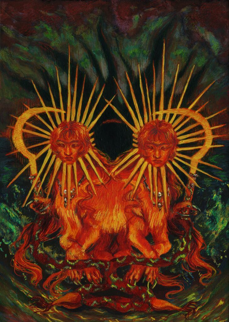 The reasons for their transformation are very complex and depend on the travelling images they embody. However, in a general context, I see the revolutions and transmutations within my paintings as the result of various forms of oppression or opposing the dualization and linearization. The characters I depict transcend time, genre, space and gender. I rarely depict characters that are explicitly gendered, as I constantly move in the liminal space. Likewise, they are not grounded in either humane or divine nature, although individual characters in my textual work have these connections made more apparent. However, I do not consider my textual work to be the only possible version of these worlds, so I do not enforce my legendarium explicitly. The most important thing for me is that I do not associate travelling images with an unchanging and constant nature, but rather with water and fire, which are never completely fixed.