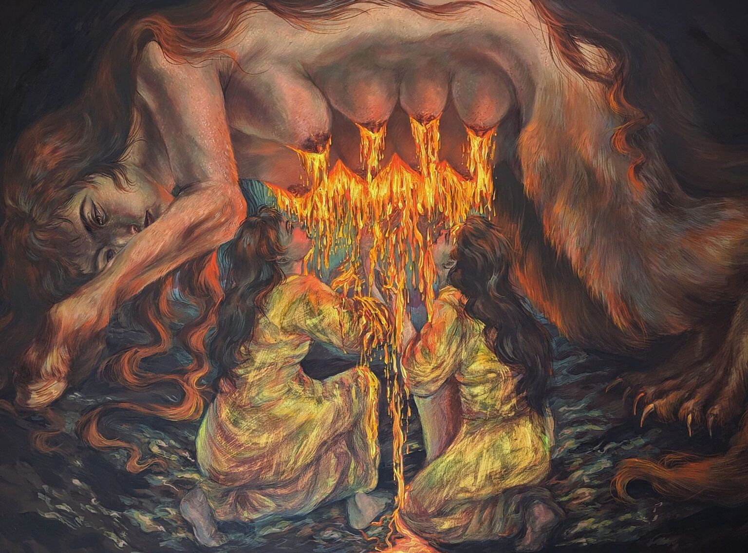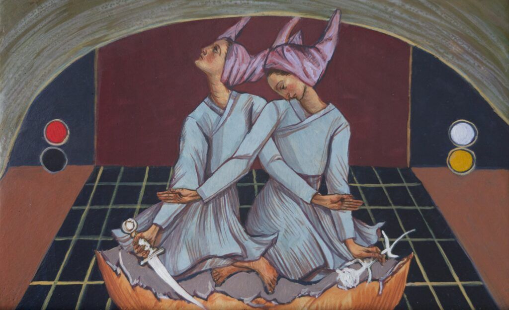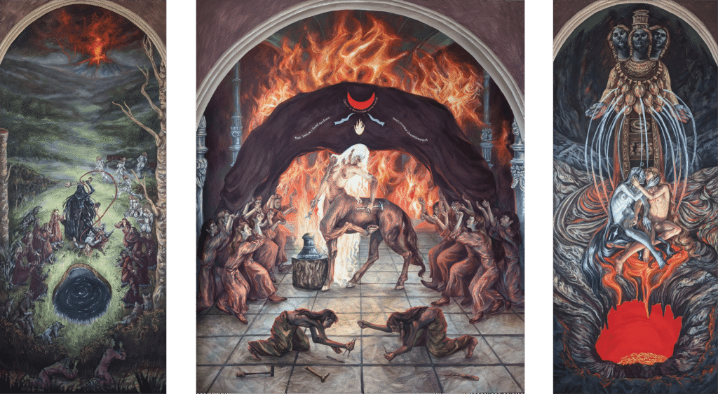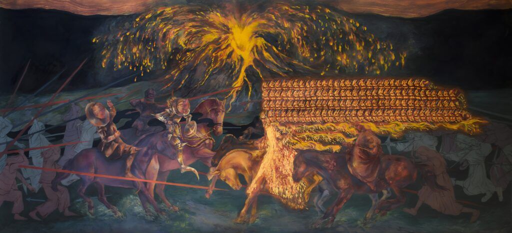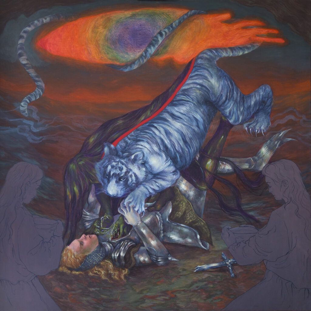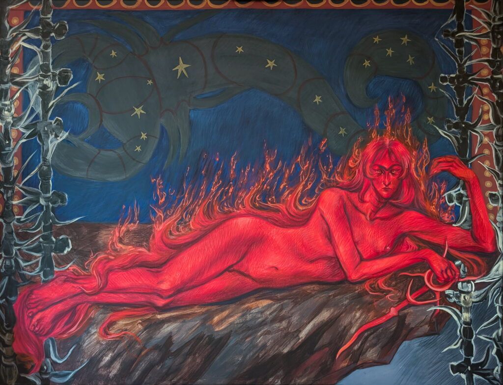 The reasons for their transformation are very complex and depend on the travelling images they embody. However, in a general context, I see the revolutions and transmutations within my paintings as the result of various forms of oppression or opposing the dualization and linearization. The characters I depict transcend time, genre, space and gender. I rarely depict characters that are explicitly gendered, as I constantly move in the liminal space. Likewise, they are not grounded in either humane or divine nature, although individual characters in my textual work have these connections made more apparent. However, I do not consider my textual work to be the only possible version of these worlds, so I do not enforce my legendarium explicitly. The most important thing for me is that I do not associate travelling images with an unchanging and constant nature, but rather with water and fire, which are never completely fixed.