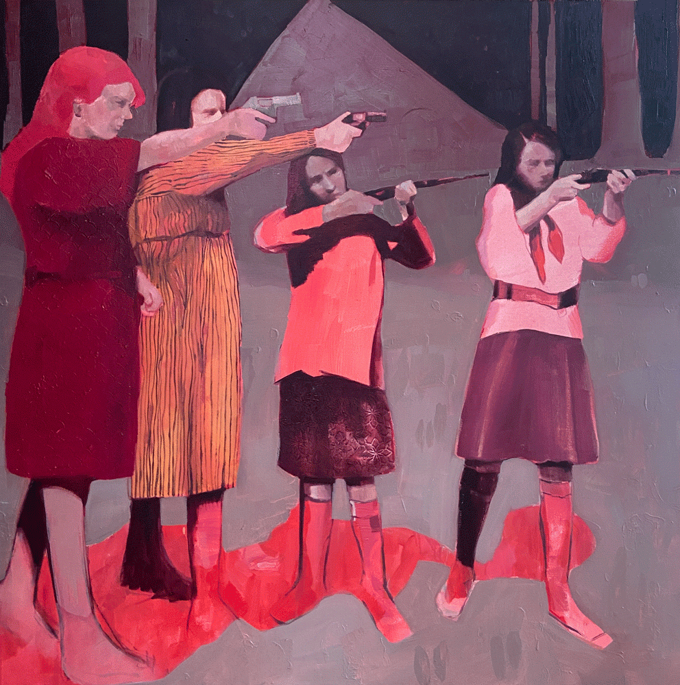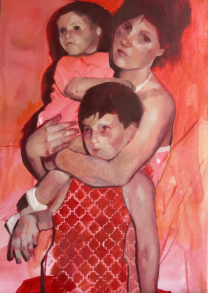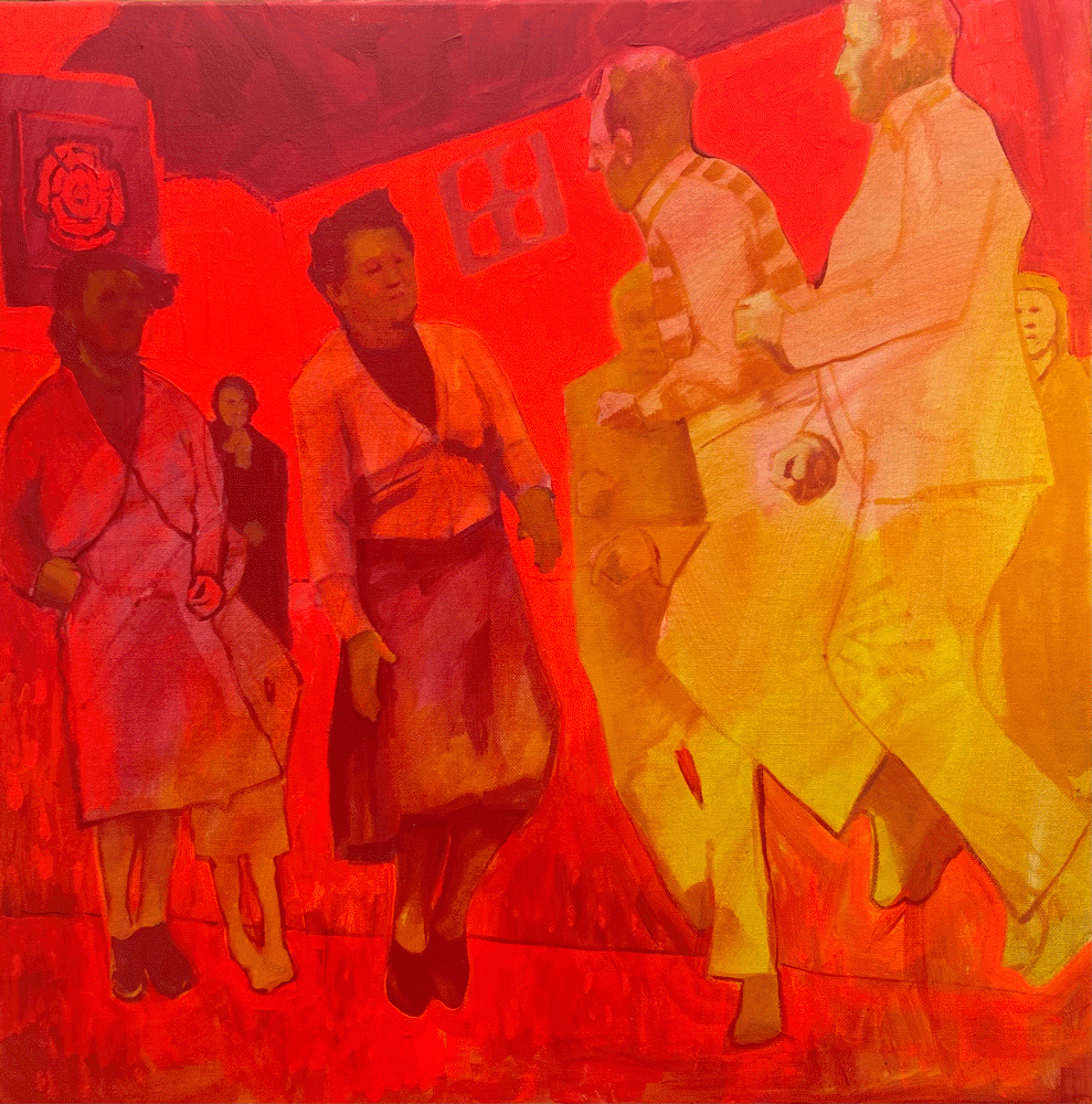 Colour palletes come from many places. I often take inspiration from other peoples paintings – sometimes from paintings of the past, sometimes from things I see on Instagram. I also take cues from reference photos. Other times, vintage photographs have a colour cast or distortion over them where things are mainly red or blue, and that can influence how I start. I seem to prefer the warm colours as they give a real punch to the painting. I start with a background of acrylic paint put down with a sponge, then work on top of that with more acrylics and oils, and as I progress, I decide how much of the background will stay.