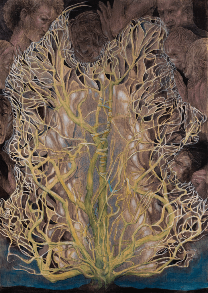 You often forgo traditional oil paints in favor of pencils on wood. What draws you to this medium, and how does it shape the aesthetic and conceptual impact of your work?