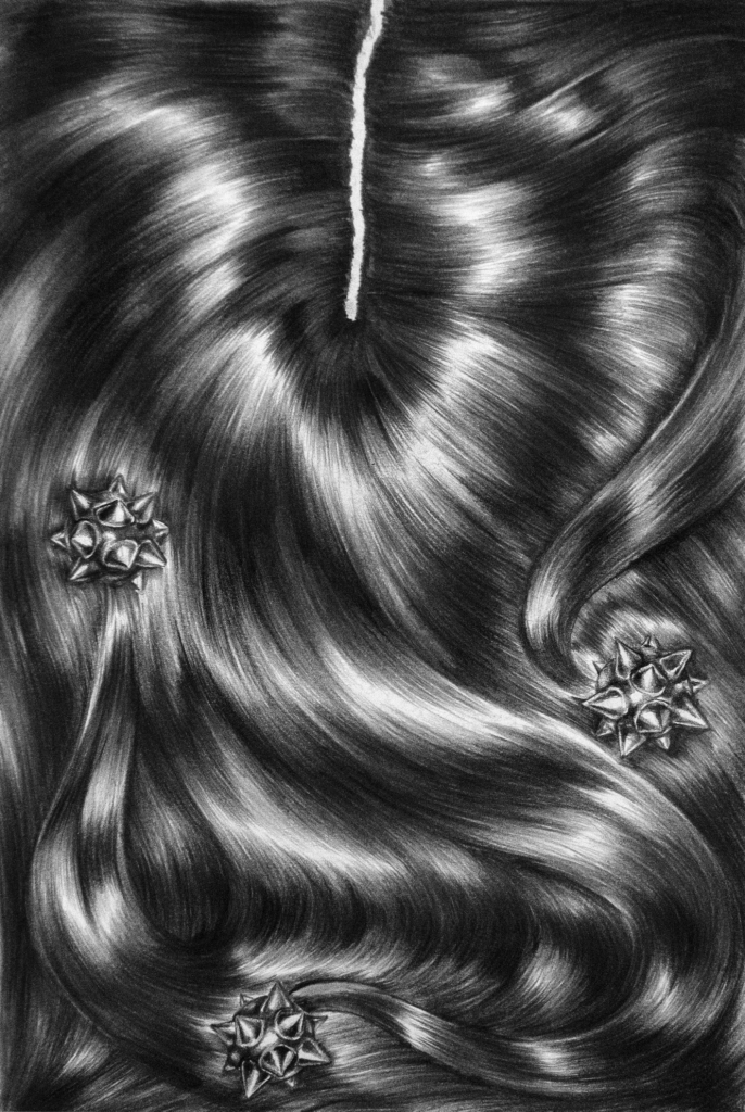 As I’ve said, the manner and quality of execution are very important to me; the frequent dissatisfaction of not being able to get the perfect result is often mentally exhausting. This feeling sometimes even becomes the central theme of a work, and turns into a compulsive repetition of one theme, as in the case with hair, which is a recurring motif in my drawings. I’ve been returning to it repeatedly since my studies at the Academy of Fine Arts in Kraków. Here, the theme is closely linked with the technique. I chose the most banal tool and technique, pencil drawings on paper, where the limited medium itself forces the search for new solutions. At the same time, it is an elegantly simple and noble medium. The obsessive repetition of a motif, the desire to one day represent it perfectly, even if it sometimes in fact deviates from the actual representation can evoke the act of hiding behind the hair, using it almost as a dense curtain which obfuscates all the strong emotions.