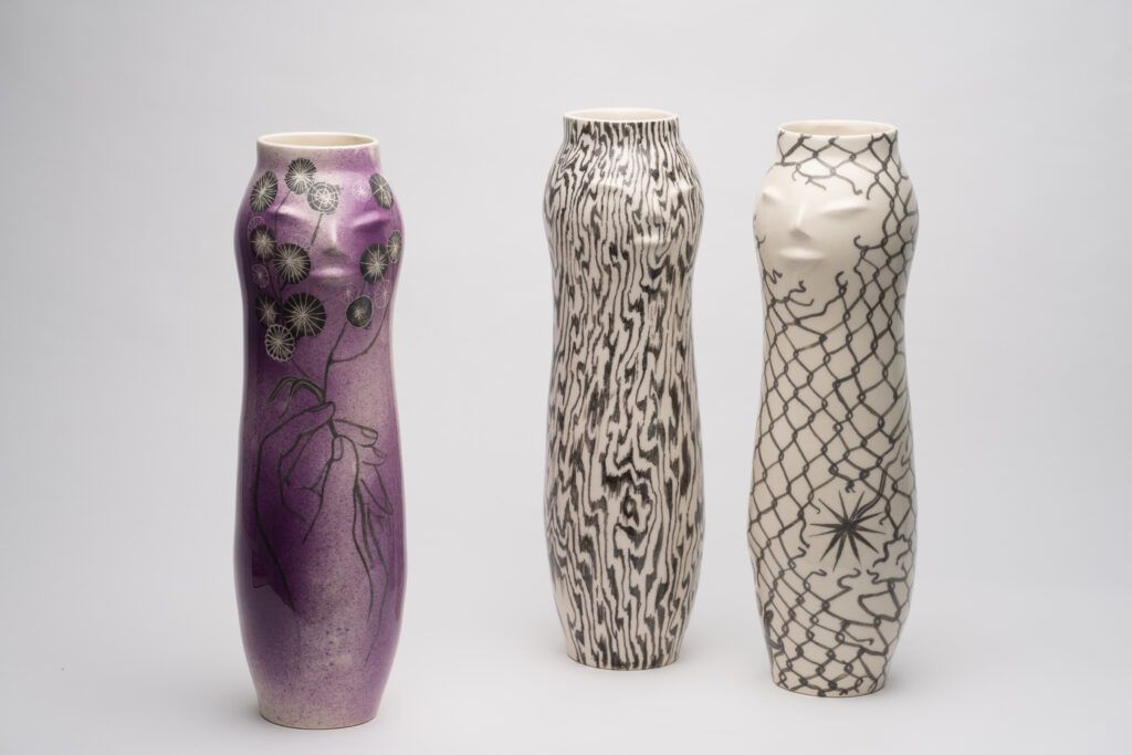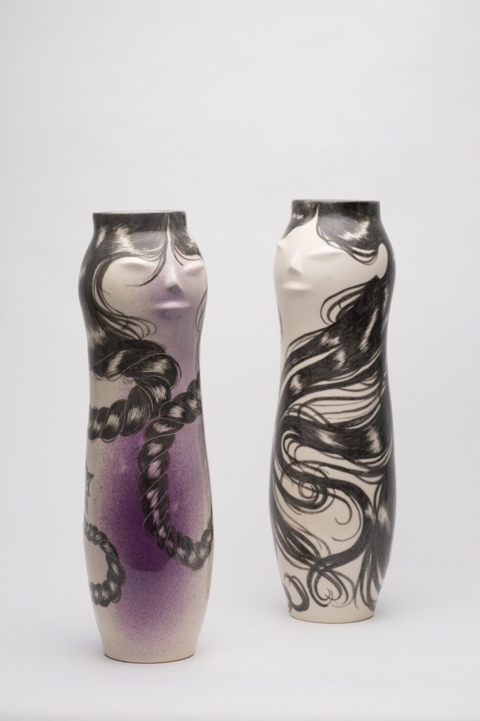 You work across different media, from drawings and paintings to ceramics and textiles. How do you choose which one to use for a specific project, and how does each one contribute to the narrative of your work?
