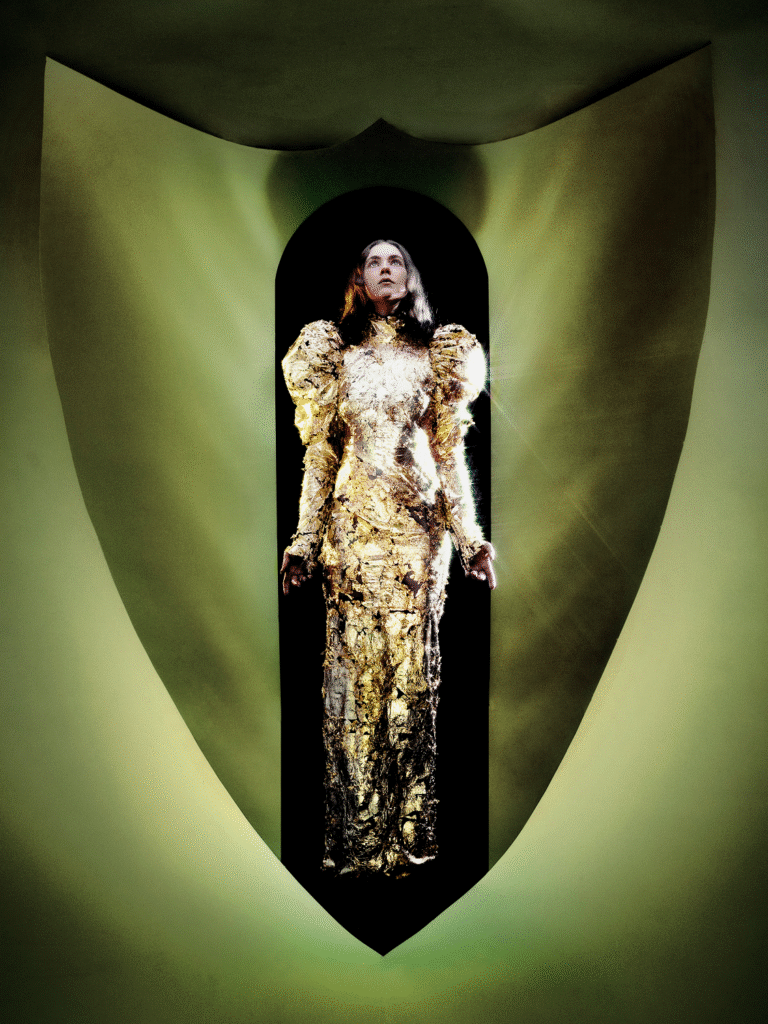 Gold leaf comes in these very thin sheets. It’s delicate and has to be handled with care. When it’s applied to a surface, it still damages easily and the gold wears of ffast. For JNN D’RC, I liked the idea that a dress so precious is dissolving with every movement. She’s a disappearing statue of a saint who never was just that.