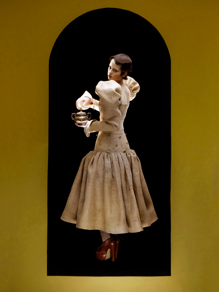 I developed some of the design elements over the years. I love my long button rows and puffy sleeves! During the material research for the JNN D’RC collection, I found myself dyeing coffee bean bags and combining them with silk fabrics. The combination of royal shapes and this unsophisticated material tingled something inside my brain. I like working with things that already have a history or connotation.