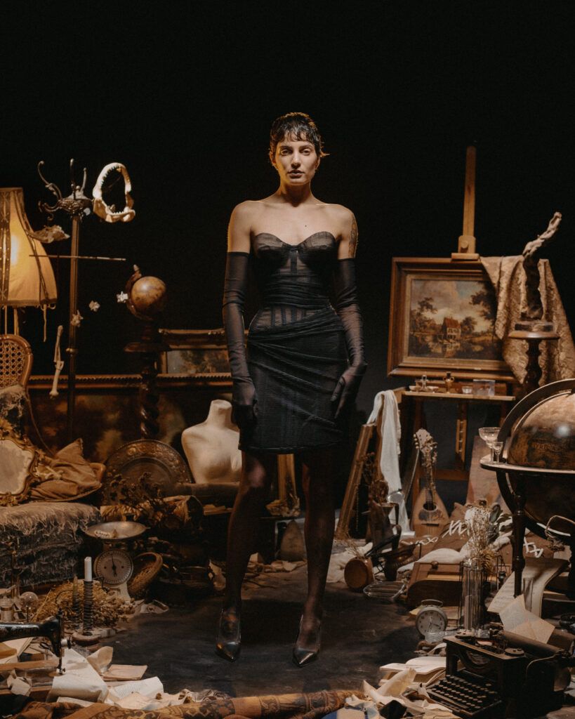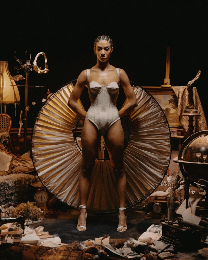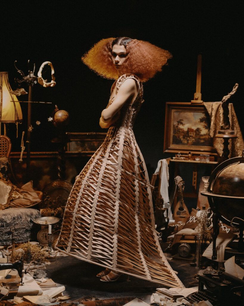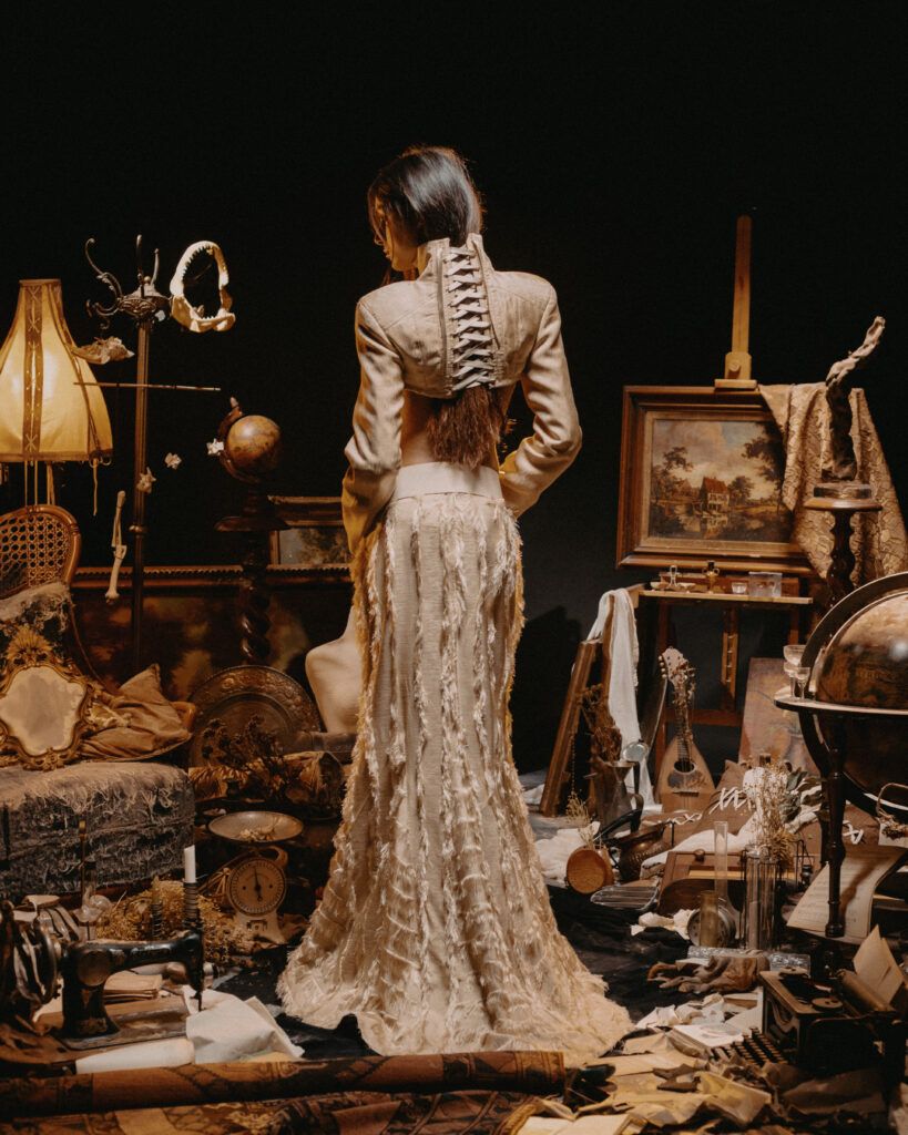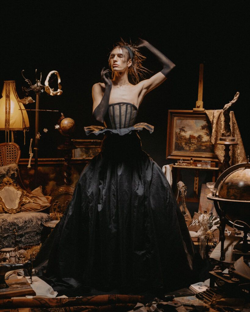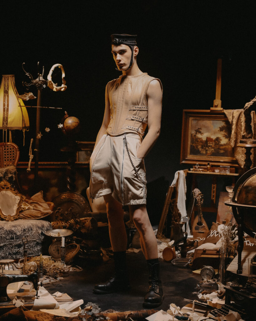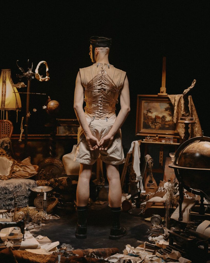 The silhouettes in the collection are deliberately misplaced, distorted as if existing in the “wrong place,” symbolising bodies in search of a form they have yet to find. Garments that stray from the figure evoke a sense of detachment from the body, while understructures and corsets play a pivotal role: at times enhancing the figure, at others constraining it, revealing the tensions of aesthetic and gender conformity.