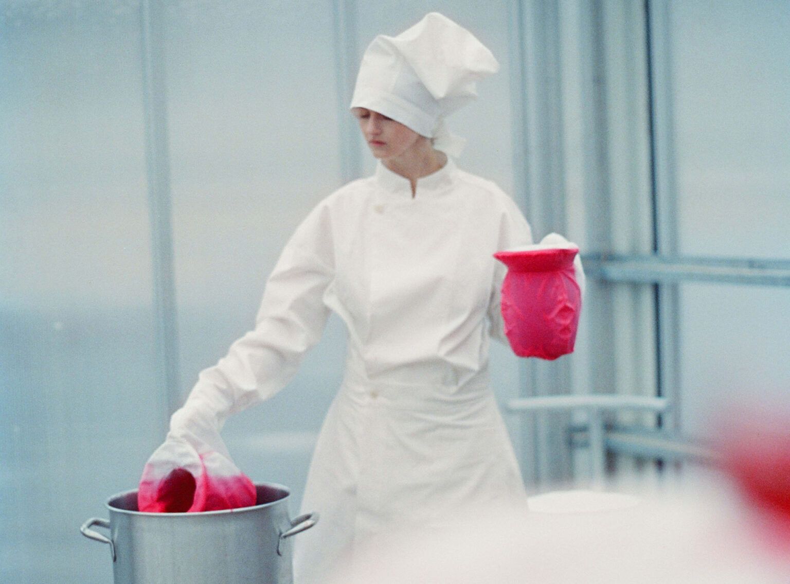 DIN DIN is a great example on how different textile media enhance each other. DIN DIN was made as wearables when SMARCH WORLD developed costumes for our film and performance The Appetizer. Our process went from appetizers to dinner, and the workwear-inspired design naturally took shape.