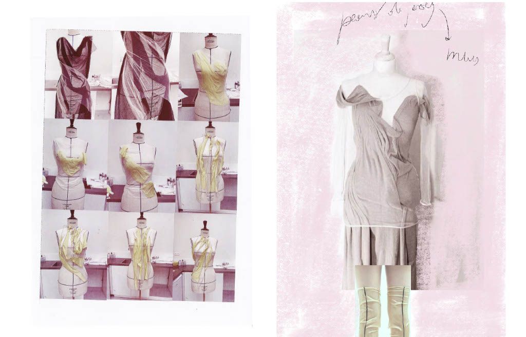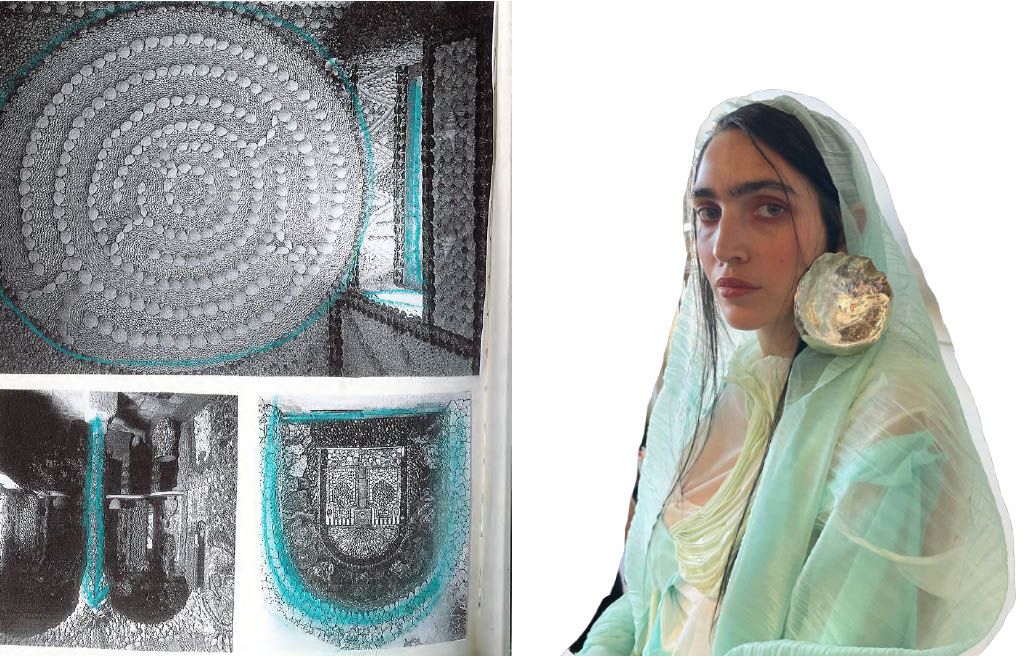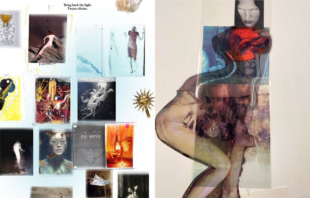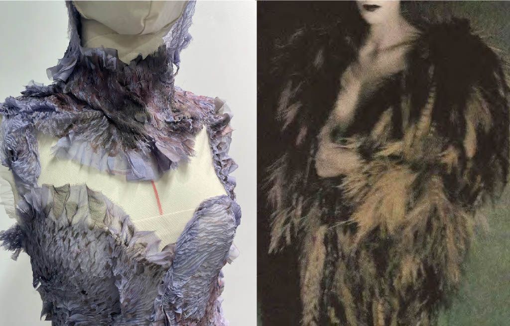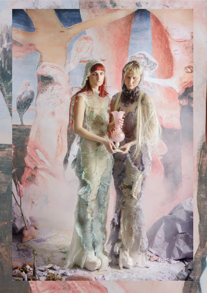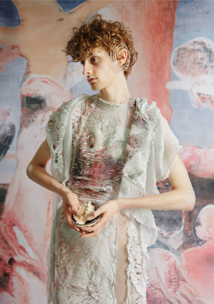 My collection, “Réenchantement”, reimagines femininity through a more inclusive and fluid lens. Instead of reinforcing traditional silhouettes, I work with garments that adapt to different bodies, using draping, bias cuts, and fabric manipulation to create movement and transformation. Many of my designs evoke the idea of shedding old skin—like moulting—allowing for rebirth and self-reinvention. I also draw from mythological and sacred references, integrating elements like veils, wings, and protective layers, which symbolise both vulnerability and strength. This balance of softness and resilience is central to my vision of the body today.