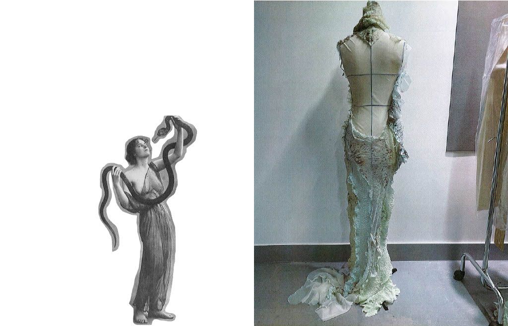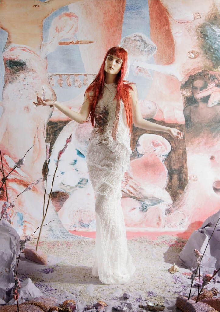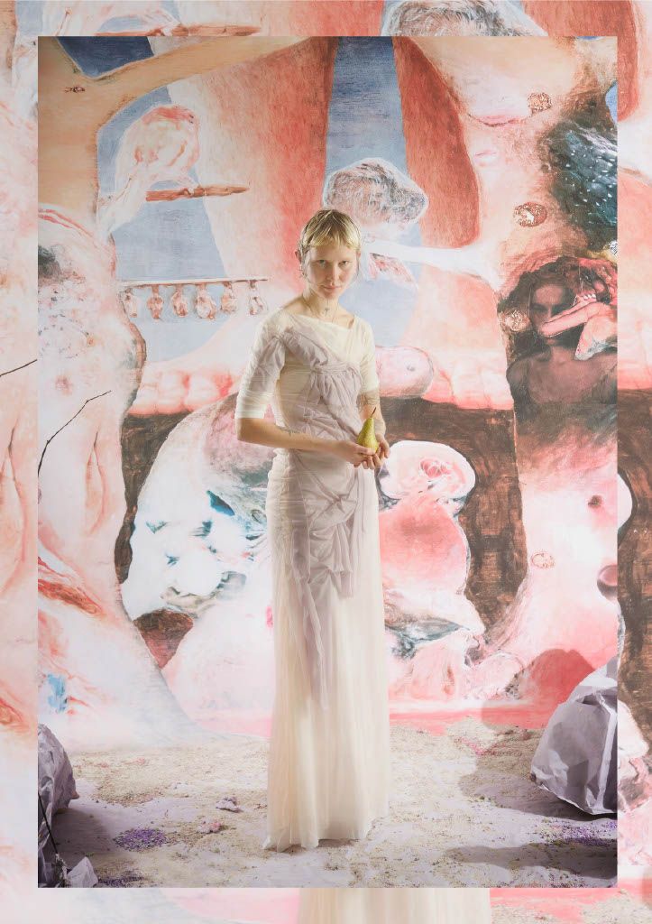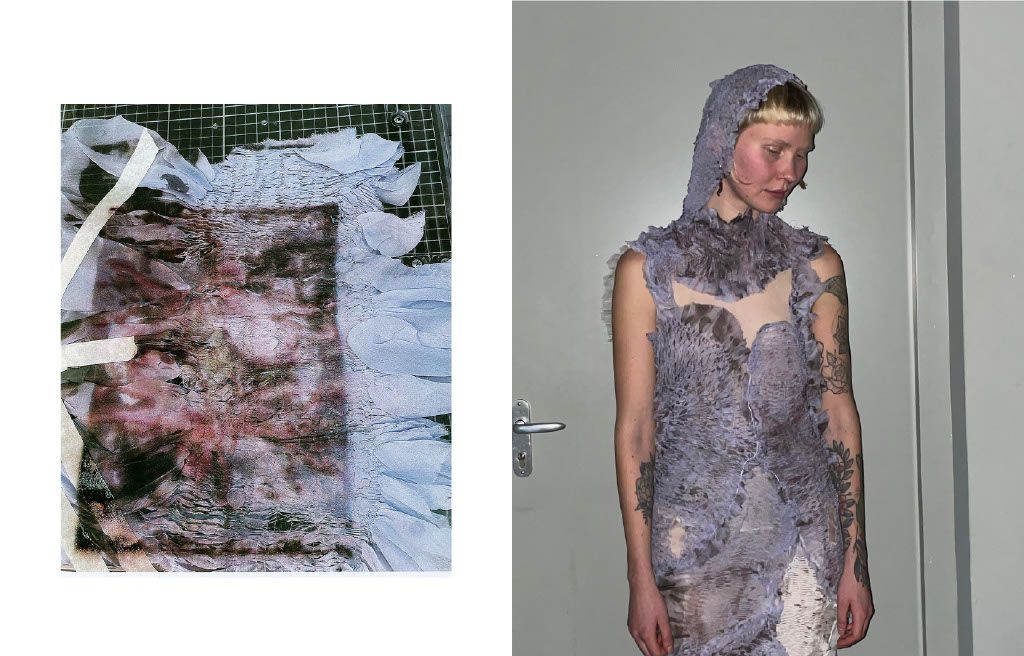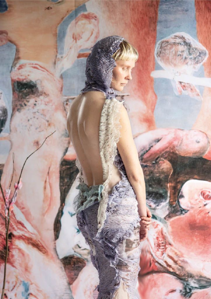 My collection, “Réenchantement”, reimagines femininity through a more inclusive and fluid lens. Instead of reinforcing traditional silhouettes, I work with garments that adapt to different bodies, using draping, bias cuts, and fabric manipulation to create movement and transformation. Many of my designs evoke the idea of shedding old skin—like moulting—allowing for rebirth and self-reinvention. I also draw from mythological and sacred references, integrating elements like veils, wings, and protective layers, which symbolise both vulnerability and strength. This balance of softness and resilience is central to my vision of the body today.