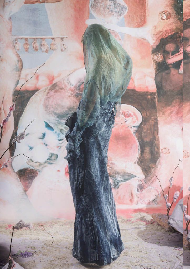 Material exploration is at the heart of my creative process. Fabrics are not just passive surfaces; they carry stories, histories, and emotions. By distressing, smocking, pleating or layering textiles, I create depth and meaning within each piece. For example, in my collection, some garments resemble “new skins” formed through intricate fabric manipulations, referencing transformation and protection. Working with dead-stock fabrics also pushes me to be innovative—each fabric comes with its own constraints, which I embrace as part of the creative journey.